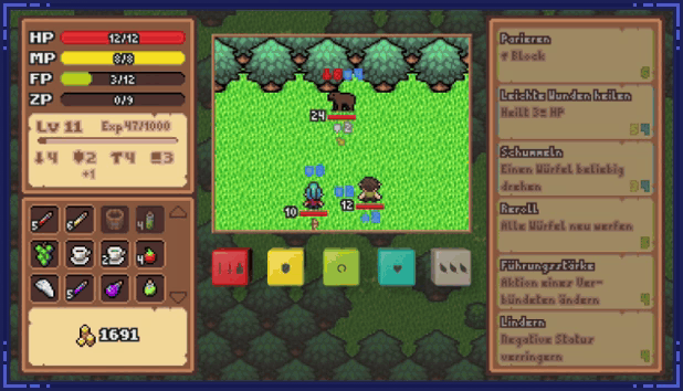 Inspiriert vom Geschehen am Pen-and-Paper-Tisch werden die Kämpfe in PixelQuest mit Würfeln ausgetragen und während das Spiel mit der Zeit sehr viel komplexer wurde als ursprünglich vorgesehen, entwickelte es sich zu einem vollwertigen JRPG mit einer entscheidenden Neuerung: einem Würfelbau-Kampfsystem. Die Kampfwürfel können beim Levelaufstieg verbessert werden, was für taktische Tiefe und Wiederspielwert sorgt.